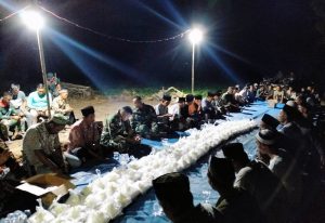 LAMPUNG SELATAN,(CENTRALBERITA.ID)– Satuan Tugas (Satgas) TNI Manunggal Membangun Desa (TMMD) ke-120 Kodim 0421/Lampung Selatan bersama warga Desa Budi Lestari, Kecamatan Tanjung Bintang, menggelar syukuran di lokasi sasaran fisik pembangunan jalan onderlagh, Rabu malam (5/6/2024).