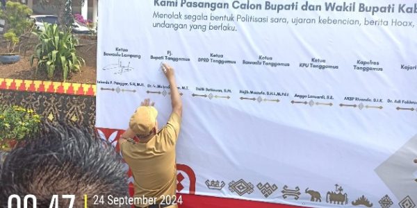 TANGGAMUS,(CENTRALBERITA.ID) – Deklarasi Kampanye Damai untuk Pemilihan Bupati dan Wakil Bupati Kabupaten Tanggamus 2024, digelar di Lapangan Upacara Pemkab, Selasa (24/9/2024).